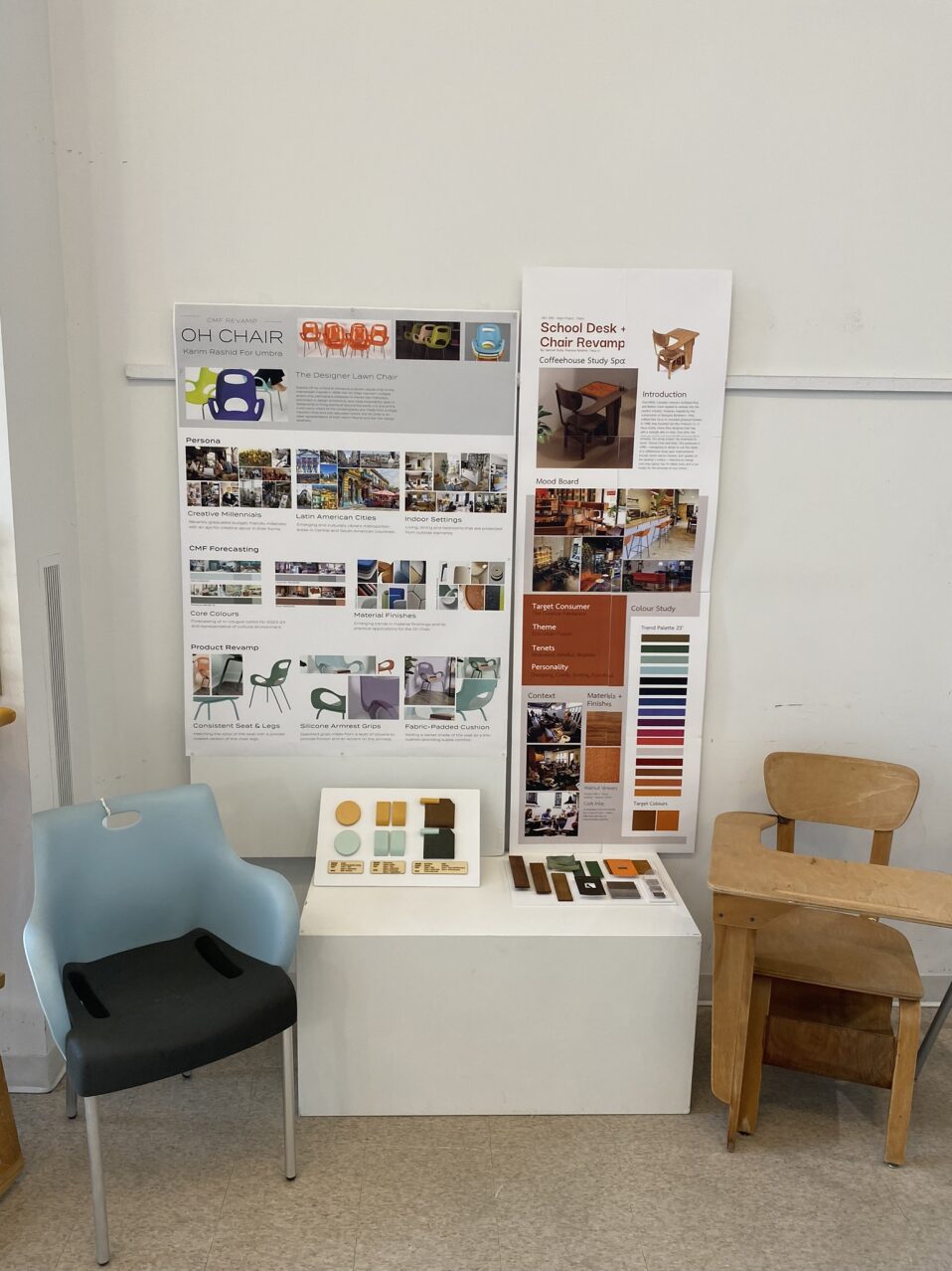 The chair project presentation poster displays the data collected from the past and present with the proposed CMF strategy to re-brand and revamp the respective chairs for a future market.